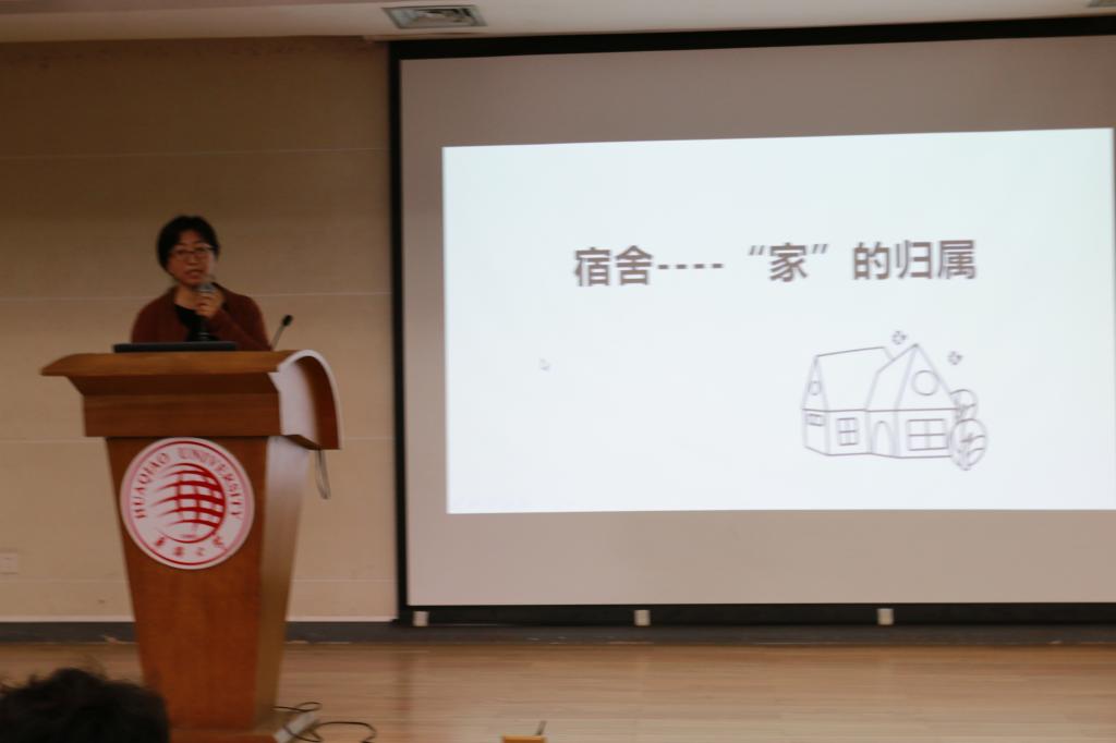 王海荣展开了以“宿舍——‘家’的归属”为主题的培训。首先强调了宿舍关系的重要性以及宿舍的物理环境和人文环境对个人内在的成长的影响。王老师通过一些常见的案例教育引导学生用恰当的方式处维护宿舍关系。通过对人际交往中的心理定位进行深入剖析,引导学生以正确的定位与人相处。作为宿舍长,不仅自身要具备心理健康方面的知识,也要善于获取信息感受室友的情绪,及时向老师反馈并给予关心帮助。
